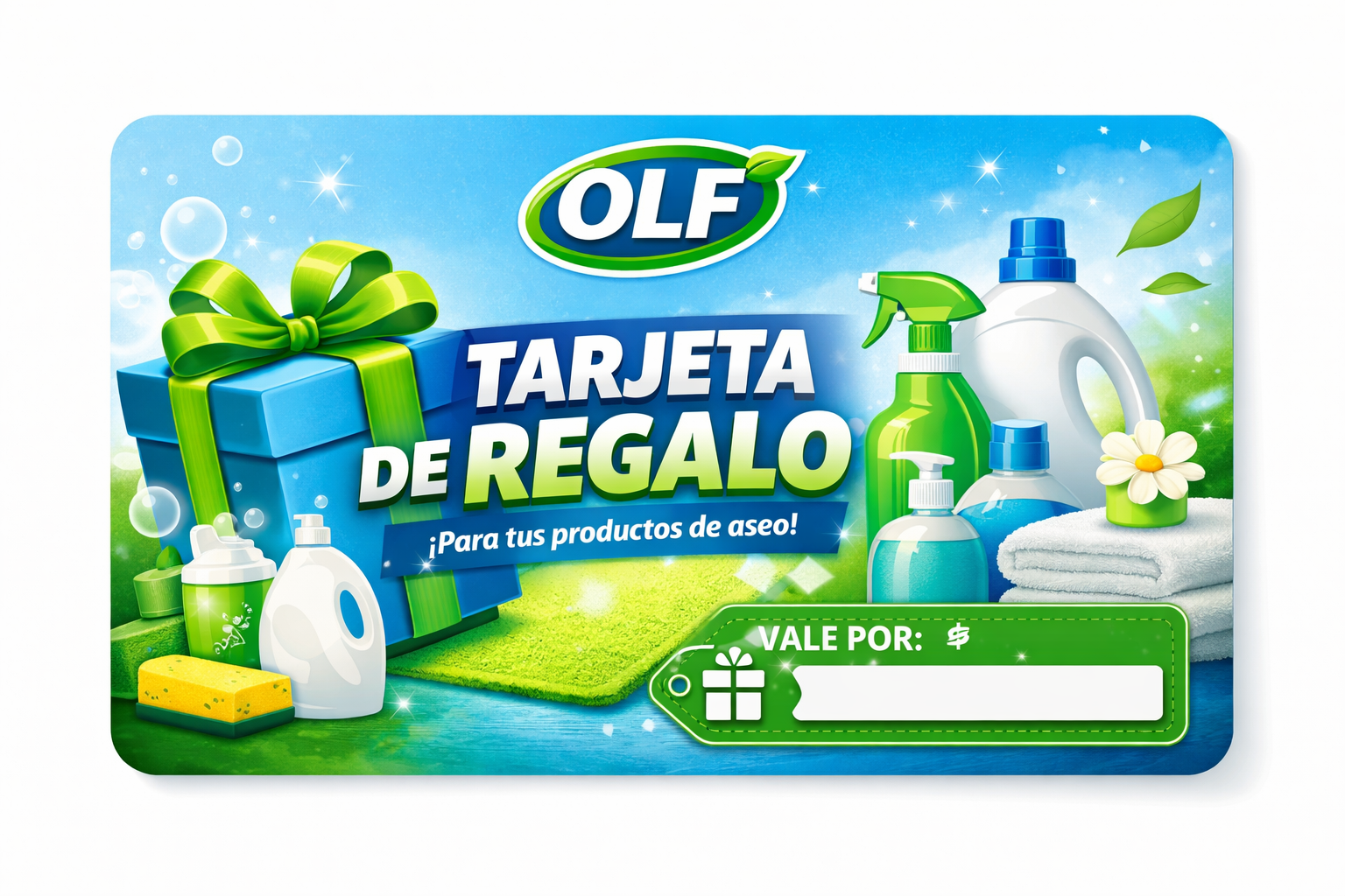 La Tarjeta de Regalo OLF es la opción ideal para sorprender con algo útil y práctico. Permite que la persona que la recibe elija libremente entre nuestra variedad de productos de aseo y limpieza para el hogar, como detergentes, desinfectantes, jabones y aromatizantes.